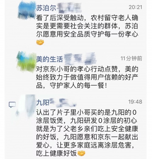 截图显示,美的相关负责人在回应中为“京东小哥”的孝心点赞,并表示“美的始终致力于做值得用户信赖的好产品,守护家人的每一餐”;九阳相关负责人表示,九阳愿意和京东一起献出爱心,让更多家庭远离涂层危害,“九阳研发0涂层的初心就是为了父老乡亲们吃上安全健康的好饭”;苏泊尔相关负责人回应称,“农村留守老人确实是亟需社会关注的群体,我们愿意用安全品质守护每一份孝心。”